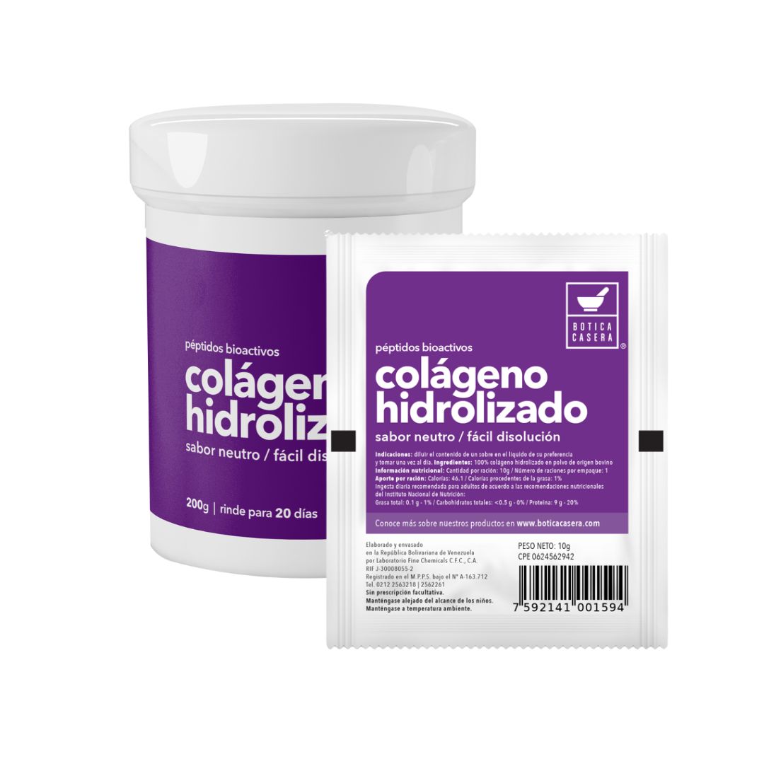 El colágeno es la proteína más abundante del cuerpo humano y es el constituyente esencial de los cartílagos, tendones, huesos y piel de nuestro organismo. El colágeno hidrolizado Botica Casera, está formado por péptidos de colágeno bioactivos (moléculas suficientemente pequeñas para poder ser digeridas por nuestro sistema digestivo) que pueden ser utilizados como fuente de nutrición para nuestro cuerpo.